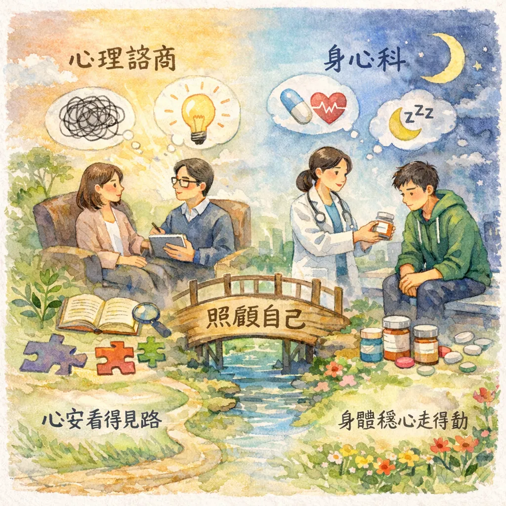 心理諮商與身心科有什麼不同?心理師如何透過「症狀、時間、生活功能、生理排除」四面向進行評估?本文解析心理師與醫師的分工:心理師陪你探索內在,醫師提供專業診斷與藥物支持。明白兩者如何互補,為自己打造最完整的身心照顧計畫。