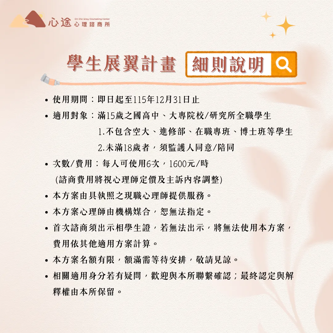「學生展翼計畫」是心途心理諮商所為國高中生、大專院校與研究所全職學生設立的優惠方案,盼在你準備起飛的時刻,給你最穩的風與支撐。