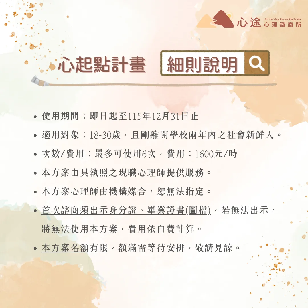 小提醒:本方案無法指定心理師。如無故缺席達兩次(未提前請假),將無法再提供服務,感謝理解與配合。
