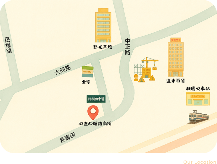 - 1.可導航至「心途心理諮商所」或輸入地址「桃園市桃園區長壽街1號」。